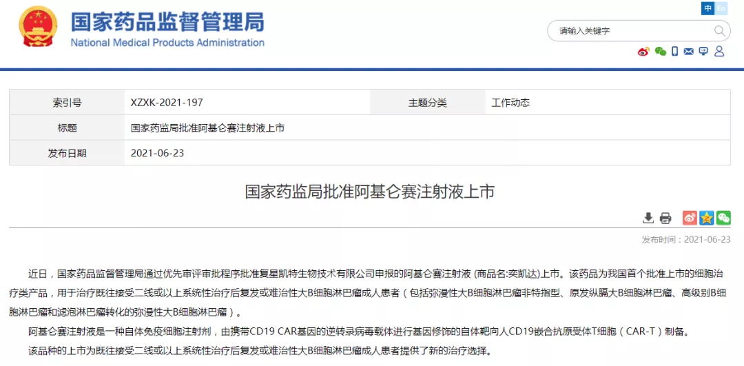 6 月 23 日,復(fù)星凱特 CAR-T 產(chǎn)品「阿基侖賽注射液」獲國家藥監(jiān)局批準,用于治療既往接受二線或以上系統(tǒng)性治療后復(fù)發(fā)或難治性大 B 細胞淋巴瘤成人患者(包括彌漫性大 B 細胞淋巴瘤非特指型、原發(fā)縱膈大 B 細胞淋巴瘤、高級別B細胞淋巴瘤和濾泡淋巴瘤轉(zhuǎn)化的彌漫性大 B 細胞淋巴瘤)。這是我國首個批準上市的細胞治療類產(chǎn)品。阿基侖賽注射液,代號 FKC876,是復(fù)星凱特從美國 Kite Pharma 引進 YESCARTA (Axicabtagene Ciloleucel) 技術(shù)、并獲授權(quán)在中國進行本地化生產(chǎn)的靶向 CD19 自體 CAR-T 細胞治療產(chǎn)品。2017 年 10 月 18 日, Yescarta 獲 FDA 批準上市,治療復(fù)發(fā)難治性大 B 細胞淋巴瘤患者,是美國 FDA 批準的首款針對特定非霍奇金淋巴瘤的 CAR-T 細胞藥物。2018 年 8 月 27 日,在歐洲獲批準上市,用于治療復(fù)發(fā)或難治性 DLBCL 和 PMBCL。目前,已有 5 款 CAR-T 細胞療法在美國獲 FDA 批準上市。復(fù)星凱特于 2017 年初從美國 Kite Pharma 引進了 Yescarta,獲得其在中國大陸、香港特別行政區(qū)和澳門特別行政區(qū)的技術(shù)及商業(yè)化權(quán)利,并擬于中國境內(nèi)進行本地化生產(chǎn)。2018 年 8 月,CDE 批準其 IND 申請,2020 年 2 月復(fù)星凱特遞交上市申請,期間僅用一年多的時間。2020 年 2 月 21 日,復(fù)星凱特阿基侖賽注射液的上市申請獲 NMPA 受理。此次上市申請是基于在中國開展的一項單臂、開放性、多中心橋接臨床試驗(FKC876-2018-001),在難治性侵襲性 NHL(大B細胞淋巴瘤)中國患者中評估了本品的安全性和療效。2020 年 3 月 10 日,正式被納入優(yōu)先審評審批。