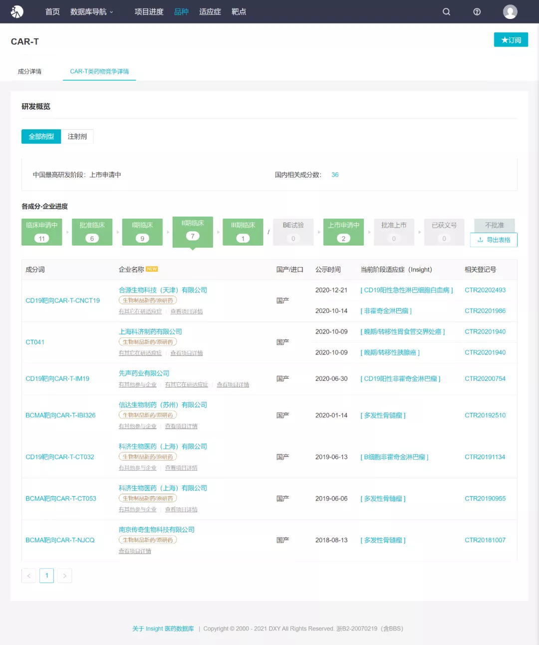 Insight醫(yī)藥情報助手上市審評時光軸小程序Insight 數(shù)據(jù)庫顯示,目前除了復(fù)星凱特外,藥明巨諾的 CAR-T 產(chǎn)品瑞基侖賽也報上市。另有多款處于臨床階段的 CAR-T 產(chǎn)品,其中以諾華的 Kymriah? (tisagenlecleucel)進展最快,已啟動 III 期臨床,另有 7 款國產(chǎn) CAR-T 產(chǎn)品已進入 II 期臨床。其中,值得一提的是,南京傳奇的 BCMA 靶向 CAR-T 已于 2020 年 8 月被 CDE 納入突破性療法程序。